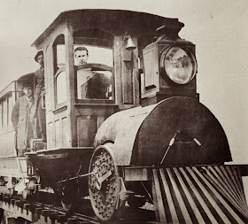 Here we have, a year later, Thomas Edison at the throttle (rheostat?) of his version of a electric passenger locomotive. Like a model train, the power came from the rails, apparently direct current. No idea what the voltage might have been. Things were simpler in 1880.
