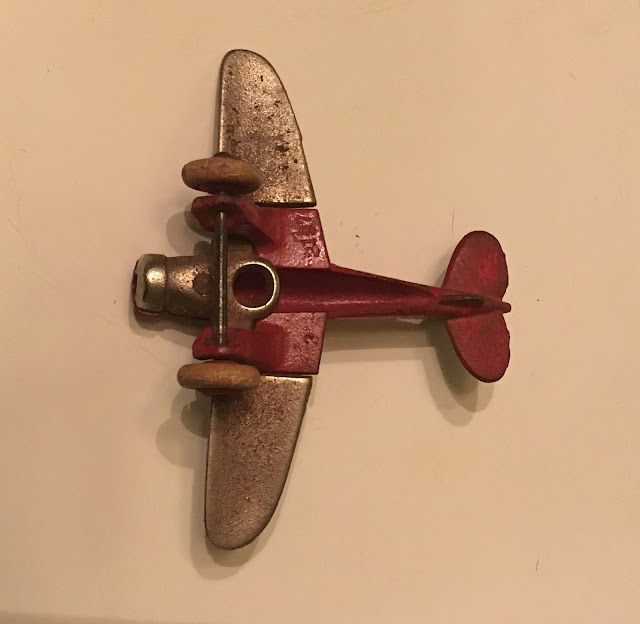Another nice little diecast toy with a 5 inch wingspan. Maker unknown, no identification, no markings except some stamped numbers "3" on the bottom of one wing, "2197" on the other.