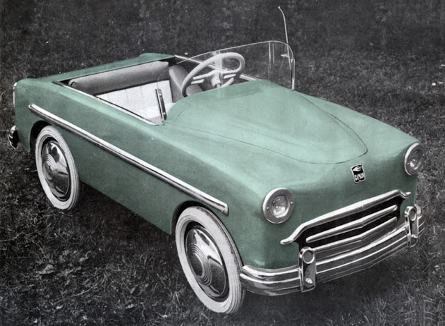 A very fancy pedal car with chain drive and imitation leather seat. I didn't have much luck finding information on the manufacturer.
