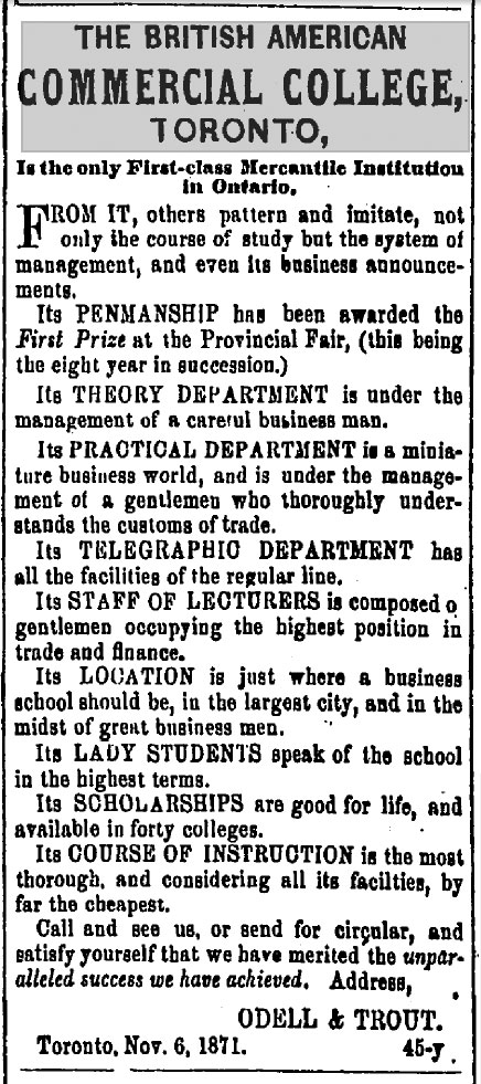 Established in Toronto in 1861, followed by schools in five other Ontario locations. General Sir Sam Steele (who headed the Yukon Detachment of the North West Mounted Police during the Klondike Gold Rush) was one of the school's most famous students. Below, from an early syllabus. The final sentence could just as well apply to today.